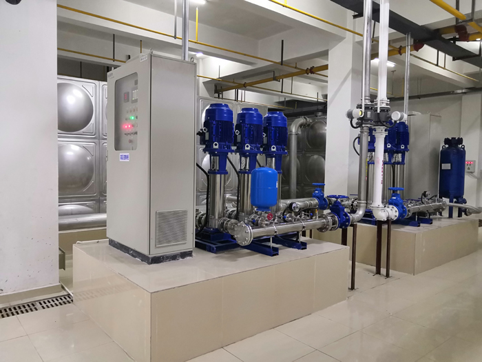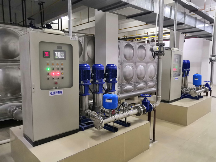 姚家?guī)X新城共有住戶1300戶,層高45層,分4個(gè)區(qū)進(jìn)行變頻供水,每層入戶供水壓0.3Mpa,為每個(gè)區(qū)選擇適當(dāng)?shù)淖冾l水泵,根據(jù)需求調(diào)整水壓和流量。變頻水泵可以根據(jù)用水量的變化自動(dòng)調(diào)節(jié),提供節(jié)能的供水。超高區(qū)同時(shí)還負(fù)責(zé)小區(qū)屋面消防水箱自動(dòng)補(bǔ)水,小區(qū)設(shè)有生活總考核水表,并裝有一戶一表,水表采用武漢市水務(wù)集團(tuán)遠(yuǎn)傳式電子水表,網(wǎng)絡(luò)抄表方式。1-12F為低區(qū)變頻供水,工作壓力0.58Mpa,13-23F為中區(qū)變頻供水,工作壓力:0.9Mpa,24-34層為高區(qū)生活變頻供水,工作壓力:1.2Mpa,供水管道材質(zhì)均不不銹鋼薄壁卡壓管,35-45層為超高區(qū)生活變頻供水,工作壓力16Mpa,供水管道材質(zhì)為PSP鋼塑復(fù)合管,所有區(qū)域泵組均采用二用一備,一對一獨(dú)立變頻運(yùn)行,具有遠(yuǎn)程智慧水務(wù)監(jiān)控平臺(tái),建立監(jiān)控系統(tǒng),實(shí)時(shí)監(jiān)測供水系統(tǒng)的運(yùn)行狀態(tài),及時(shí)發(fā)現(xiàn)和解決可能出現(xiàn)的問題。地下室采用2臺(tái)100噸不銹鋼蓄水箱并列蓄水,每臺(tái)蓄水箱獨(dú)立進(jìn)水遙控浮球閥控制水箱自動(dòng)進(jìn)水,獨(dú)立放空、溢流閥道閥,水箱出水均設(shè)備手動(dòng)出水總閥,可實(shí)現(xiàn)水箱清洗時(shí)不停水。